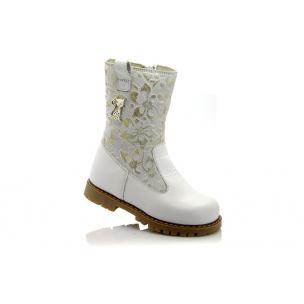 Зимние сапожки ортопедические белого цвета с кожаной апликацией. С внутренней стороны на молнии. Снаружи кожаные, внутри - натуральный мех (цигейка). Высокая твердая пятка, ортопедический супинатор и не скользящая тракторная подошва.