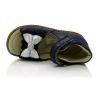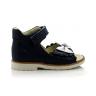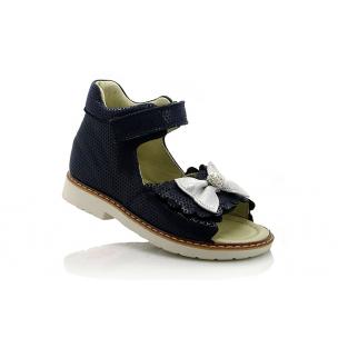 Босоножки ортопедические темно-синего (почти черного) цвета с серебристым бантиком и шариком из камней. Сверху фиксируются двумя липучками. Снаружи и внутри кожаные. Высокая твердая пятка, супинатор и ортопедический каблук Томаса.