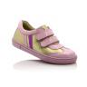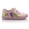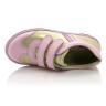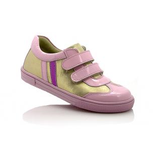 Кроссовки нежно-розового цвета с золотистыми вставками. Сверху фиксируются двумя липучками. Снаружи и внутри кожаные. Есть твердая пятка и супинатор.