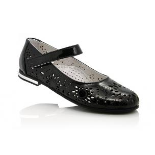 Туфли черного цвета (с перфорацией). Фиксируются липучкой, кожаные внутри и снаружи. Имеют твердую пятку и супинатор.