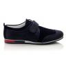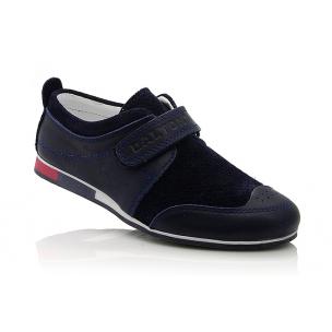 Мокасины темно-синего цвета (с мелкой перфорацией). Сверху фиксируются липучкой, снаружи кожа + нубук, внутри кожа. Есть супинатор и твердая пятка.