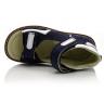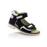 Босоножки ортопедические темно-синего цвета с белыми вставками. Сверху фиксируются двумя липучками. Снаружи нубук, внутри кожаные. Высокая твердая пятка, супинатор и ортопедический каблук Томаса.