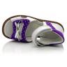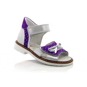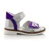Босоножки ортопедические серебристого цвета с сиреневыми вставками. Сверху фиксируются двумя липучками. Снаружи кожа + нубук, внутри кожаные. Высокая твердая пятка, супинатор и ортопедический каблук Томаса.
