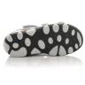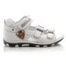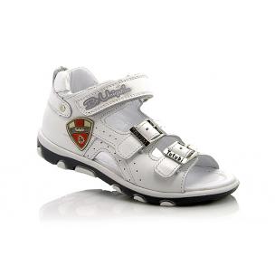 Босоножки белого цвета. Снизу фиксируются 2-мя застежками, сверху липучкой. Снаружи и внутри кожаные, есть супинатор, твердая пятка.