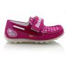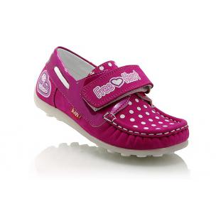 Мокасины малтнового цвета (в горошек). Сверху фиксируются липучкой, снаружи гладкий нубук, внутри кожаные. Есть супинатор и твердая пятка.