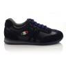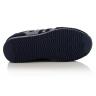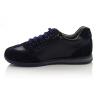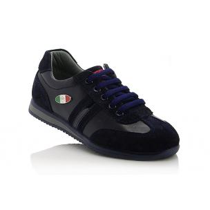 Кроссовки темно-синего цвета. Сверху регулируются шнурками, с внутренней стороны - на молнии. Снаружи кожа + замша, внутри кожаные. Есть твердая пятка и супинатор.