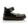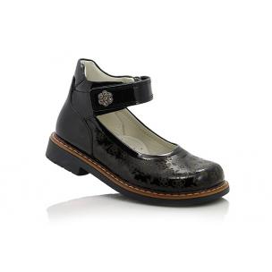 Туфли ортопедические черного цвета с лазерной обработкой (лакированные). Сверху регулируются липучкой. Снаружи и внутри кожаные. Высокая твердая пятка, супинатор и ортопедический каблук Томаса.