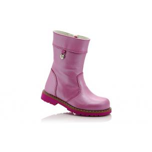 Зимние ортопедические сапожки розового цвета (перламутровые). С внутренней стороны на молнии. Снаружи кожаные, внутри - натуральный мех (цигейка). Высокая твердая пятка, ортопедический супинатор и не скользящая подошва с каблуком Томаса.