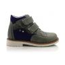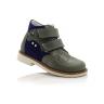 Демисезонные ортопедические ботинки серого цвета с темно-синими вставками. Сверху регулируются 2-мя липучками. Снаружи жирный нубук (кожа) + нубук, внутри на флисе. Высокая твердая пятка, супинатор и ортопедический каблук Томаса.