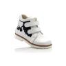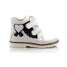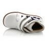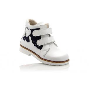 Ортопедические ботинки белого цвета с темно-синими вставками. Сверху регулируются 2-мя липучками. Снаружи кожа + нубуковые вставки, внутри на флисе. Высокая твердая пятка, супинатор и ортопедический каблук Томаса.