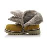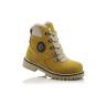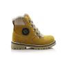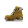 Зимние ботинки желтого цвета. Сверху фиксируются шнурками, с внутренней стороны на молнии. Снаружи жирный нубук, внутри натуральный мех - цигейка. Высокая твердая пятка, тракторная не скользящая подошва.
