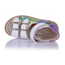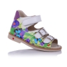 Босоножки ортопедические белого цвета с цветным принтом. Сверху фиксируются липучкой и двумя застежками. Снаружи и внутри кожаные. Высокая твердая пятка, супинатор и ортопедический каблук Томаса.