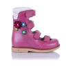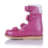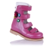 Лечебные босоножки-берцы розового цвета с закрытым носком. Сверху фиксируются четырьмя липучками. Снаружи и внутри кожаные. Завышенная твердая пятка, супинатор и ортопедический каблук Томаса.