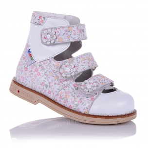 Босоножки-берцы ортопедические с разноцветными цветочками (закрытый носок). Сверху фиксируются тремя липучками. Снаружи и внутри кожаные. Завышенная твердая пятка, супинатор и ортопедический каблук Томаса.