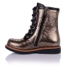 Демисезонные ортопедические ботинки темно-золотистого цвета. Сверху регулируются шнурками, С внутренней стороны - на молнии. Снаружи кожа, внутри - на флисе. Есть ортопедический каблук Томаса, твердая пятка и супинатор.