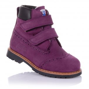 Зимние ортопедические ботинки фиолетового цвета. Сверху регулируются двумя липучками. Снаружи нубук, внутри - натуральный мех (цигейка). Есть ортопедический каблук Томаса, высокий твердый задник и супинатор.