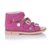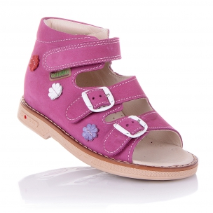 Ортопедические босоножки светло-фиолетового цвета с разноцветными цветочками, которые пришиты к изделию. Внутренняя и внешняя часть выполнена из натуральной кожи. Удобная фиксация на два ремешка и липучку позволяет подобрать туфли на ногу разной полноты и высоты свода. Стелька с супинатором и твердый задник обеспечивают физиологически правильное положение ножки. Подошва, износостойкая из термокаучука, со скошенным каблуком Томаса и антишоковыми вставками, которые снимают ударную нагрузку на пяточную кость.