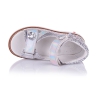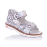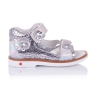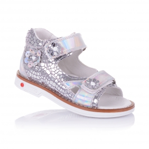 Гламурные ортопедические босоножки с оригинальным серебристым принтом на коже, который отливает на солнце перламутром и аппликацией из цветочков. Внутренняя и внешняя часть изделия выполнены из натуральной кожи. Удобная фиксация на две липучки позволяет подобрать обувь на ногу разной полноты и высоты свода. Стелька с супинатором и твердый задник обеспечивают физиологически правильное положение ножки. Подошва, износостойкая из термокаучука, со скошенным каблуком Томаса и антишоковыми вставками, которые снимают ударную нагрузку на пяточную кость. В обуви такого качества Ваш ребенок будет чувствовать себя комфортно, а главное- эксклюзивно!
