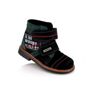 Ботинки ортопедические Woopy orthopedic черного цвета с серыми вставками. Сверху регулируются двумя липучками. Снаружи нубук, внутри - флис. Высокая твердая пятка, супинатор и ортопедический каблук Томаса.