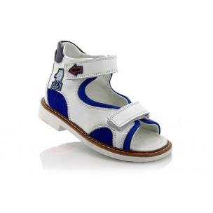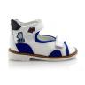 Босоножки ортопедические Woopy orthopedic белого цвета с ярко-синими вставками. Фиксируются двумя липучками. Снаружи кожа + нубук, внутри кожа. Высокая твердая пятка, супинатор и ортопедический каблук Томаса.