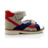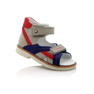 Босоножки ортопедические Woopy orthopedic серого цвета с красно-синими вставками. Фиксируются двумя липучками. Снаружи нубук, внутри кожа. Высокая твердая пятка, супинатор и ортопедический каблук Томаса.