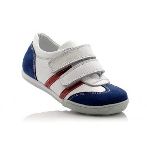 Кроссовки белого цвета с красно-синими вставками. Сверху регулируются двумя липучками. Снаружи кожа + нубук, внутри - кожаные. Есть твердая пятка и супинатор.
