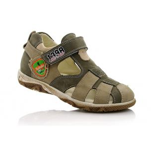 Босоножки коричневого цвета с бежевыми вставками (с закрытым носком). Сверху регулируются липучкой. Снаружи нубук, внутри кожаные, есть супинатор, твердая пятка.