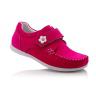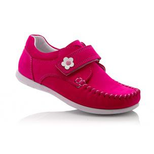Мокасины ярко-розового цвета. Сверху фиксируются липучкой, снаружи нубук, внутри кожа. Есть супинатор и твердая пятка.
