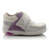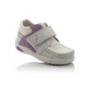 Мокасины Minimen белого цвета со светло-сиреневой вставкой, на липучке. Внутри и снаружи кожаные, есть супинатор и твердая пятка.