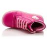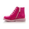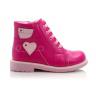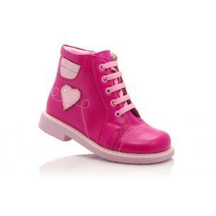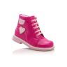 Ботинки ортопедические розового цвета. Сверху регулируются шнурками, сбоку на молнии. Снаружи кожа, внутри - флис. Высокая твердая пятка, супинатор и ортопедический каблук Томаса.