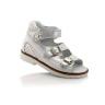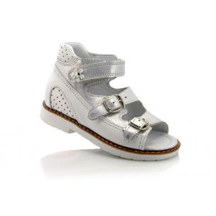 Босоножки ортопедические белого цвета с серебристыми перламутровыми вставками. Снизу регулируются двумя застежками, сверху липучкой. Снаружи и внутри кожаные. Высокая твердая пятка, супинатор и ортопедический каблук Томаса.