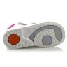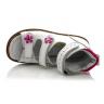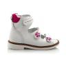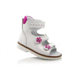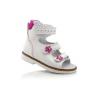 Босоножки ортопедические белого цвета с розовыми цветочками (с высоким берцем) и открытым носком. Сверху фиксируются тремя липучками. Снаружи и внутри кожаные. Завышенная твердая пятка, супинатор и ортопедический каблук Томаса.