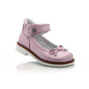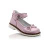 Туфли ортопедические розового цвета. Сверху регулируются липучкой. Снаружи и внутри кожаные. Высокая твердая пятка, супинатор и ортопедический каблук Томаса.