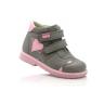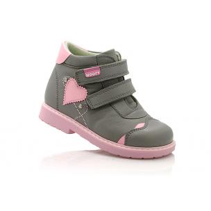 Ботинки демисезонные серого цвета с розовыми вставками. Сверху регулируются двумя липучками. Снаружи кожа, внутри - флис. Высокая твердая пятка, супинатор и ортопедический каблук Томаса.