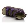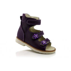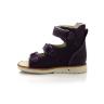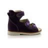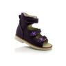 Босоножки ортопедические фиолетового цвета (с высоким берцем) и открытым носком. Сверху фиксируются тремя липучками. Снаружи - жирный нубук, внутри кожаные. Завышенная твердая пятка, супинатор и ортопедический каблук Томаса.