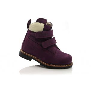 Зимние ботинки фиолетового цвета. Сверху фиксируются двумя липучками. Снаружи нубук, внутри натуральный мех - цигейка. Высокая твердая пятка, супинатор и ортопедическая не скользящая подошва.