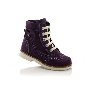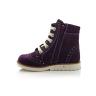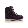 Ботинки фиолетового цвета. Сверху фиксируются шнурками, сбоку на молнии. Снаружи жирный нубук, внутри утепленные флисом. Высокая твердая пятка, супинатор и ортопедический каблук Томаса.