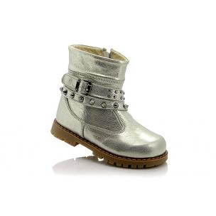 Зимние сапожки ортопедические серебристого цвета. С внутренней стороны на молнии. Снаружи кожа, внутри - натуральный мех (цигейка). Высокая твердая пятка, ортопедический супинатор и не скользящая тракторная подошва.