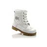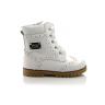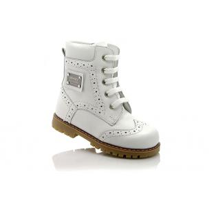 Зимние ботинки ортопедические белого цвета. Сверху на шнурках, с внутренней стороны на молнии. Снаружи кожаные, внутри - натуральный мех (цигейка). Высокая твердая пятка, ортопедический супинатор и не скользящая тракторная подошва.