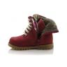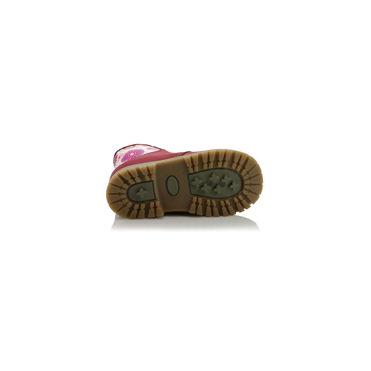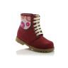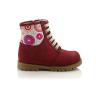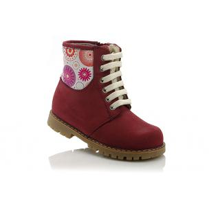 Зимние ботинки ортопедические красно-бордового цвета с апликацией. Сверху на шнурках, с внутренней стороны на молнии. Снаружи жирный нубук, внутри - натуральный мех (цигейка). Высокая твердая пятка, ортопедический супинатор и не скользящая тракторная подошва.