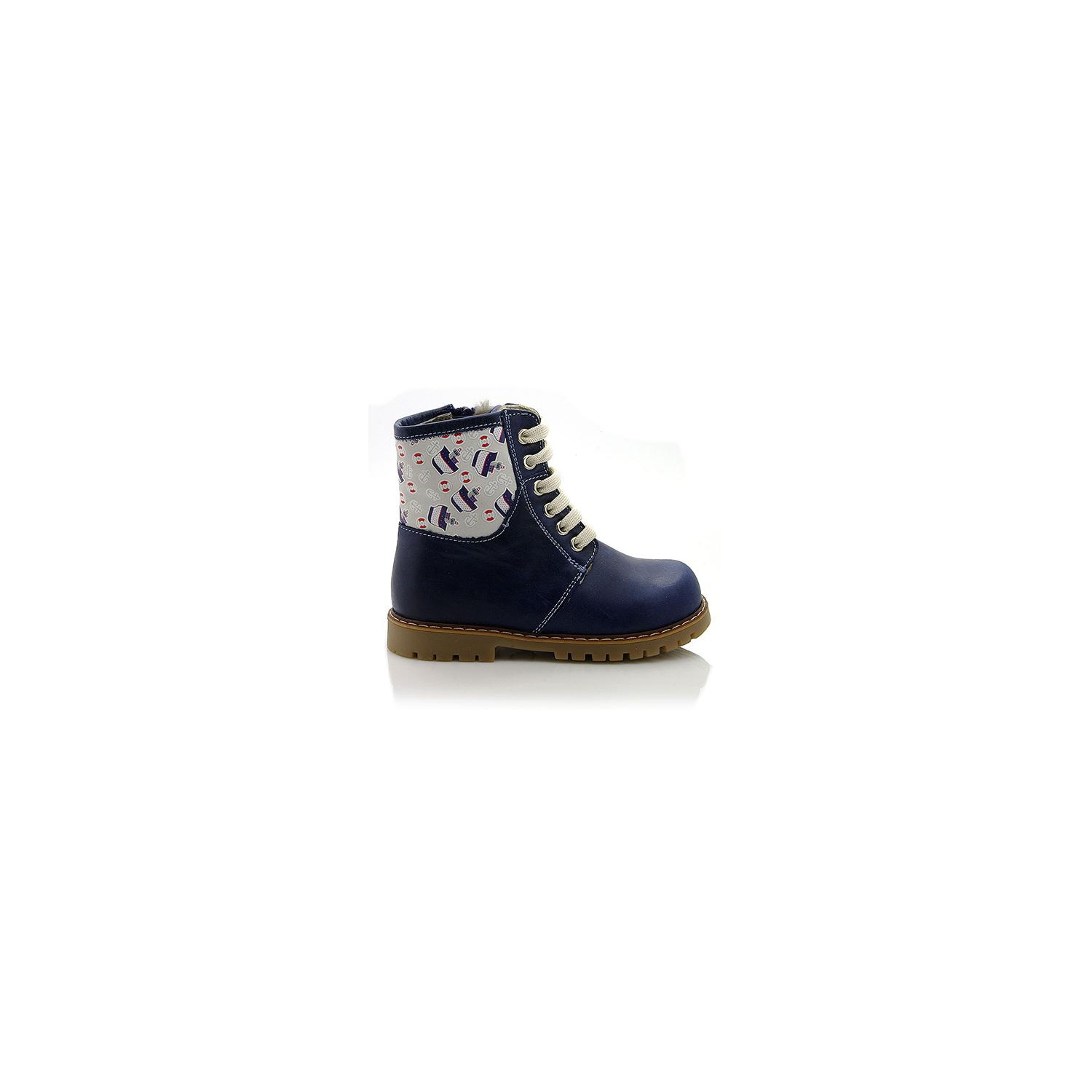 Зимние ботинки ортопедические синего цвета с апликацией. Сверху на шнурках, с внутренней стороны на молнии. Снаружи жирный нубук, внутри - натуральный мех (цигейка). Высокая твердая пятка, ортопедический супинатор и не скользящая тракторная подошва.