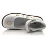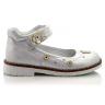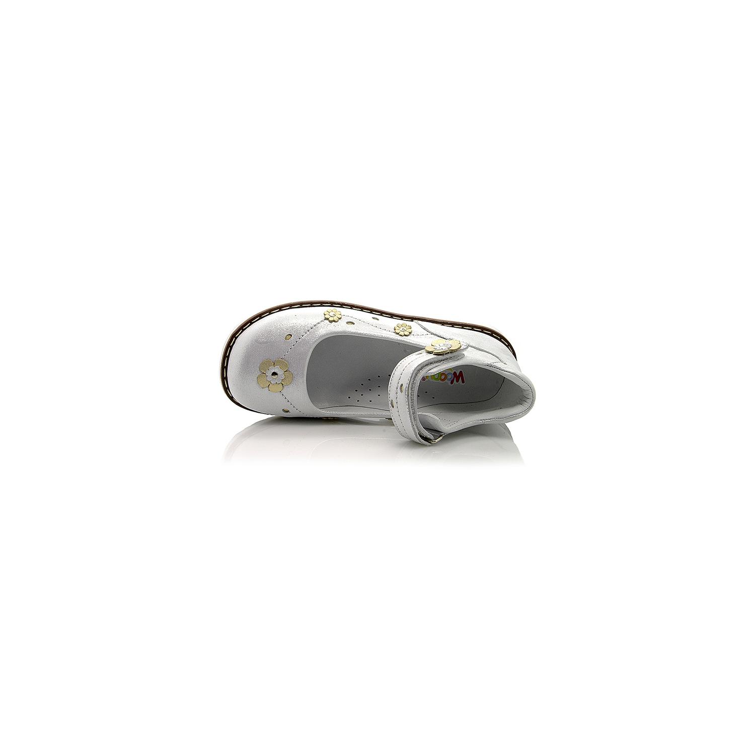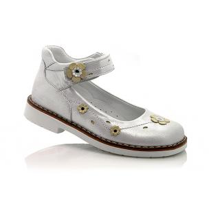 Туфли ортопедические серебристого цвета с золотистыми цветочками. Сверху регулируются липучкой. Снаружи и внутри кожаные. Высокая твердая пятка, супинатор и ортопедический каблук Томаса.