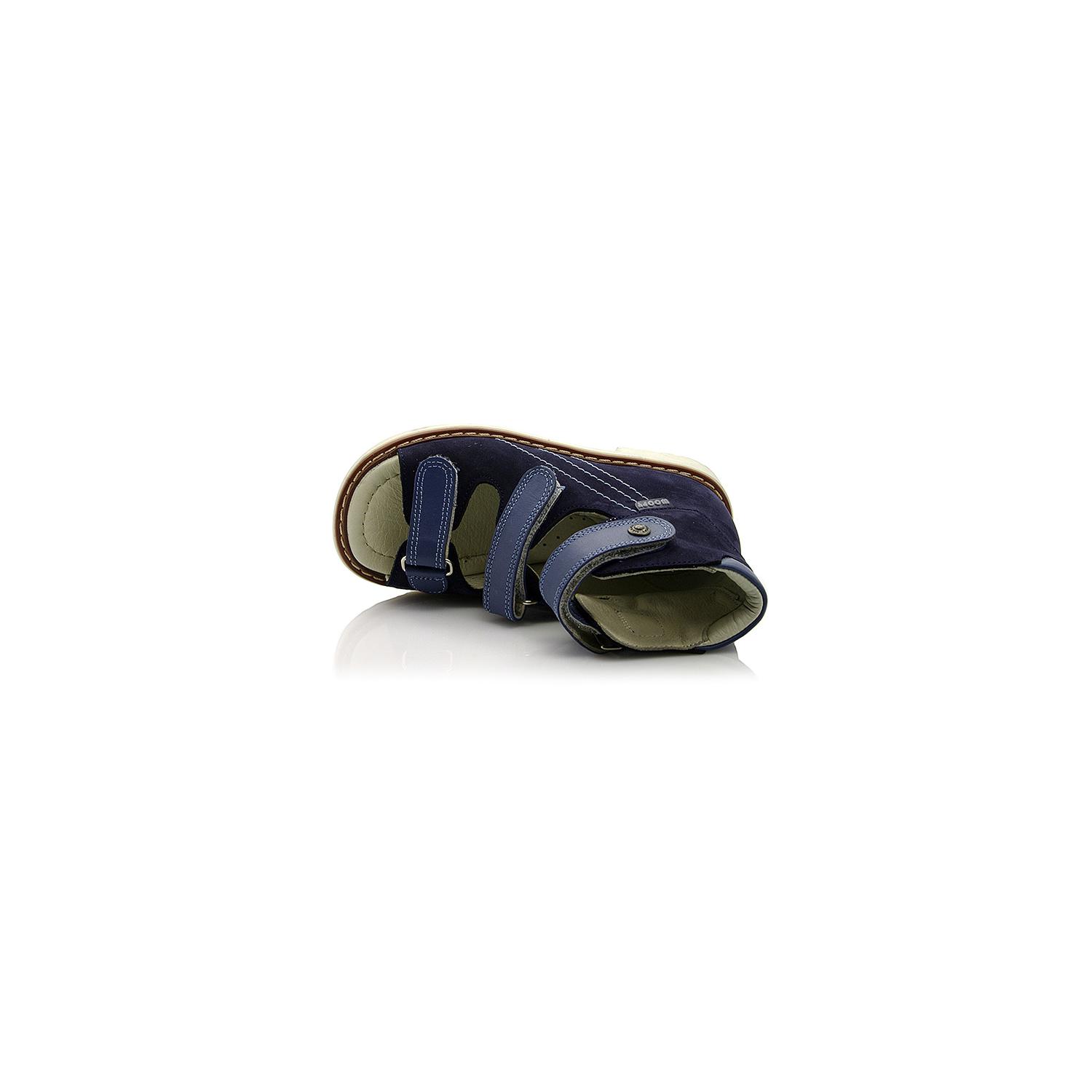 Босоножки ортопедические темно-синего цвета (с высоким берцем) и открытым носком с голубыми липучками. Сверху фиксируются тремя липучками. Снаружи кожа + нубук, внутри кожаные. Завышенная твердая пятка, супинатор и ортопедический каблук Томаса.