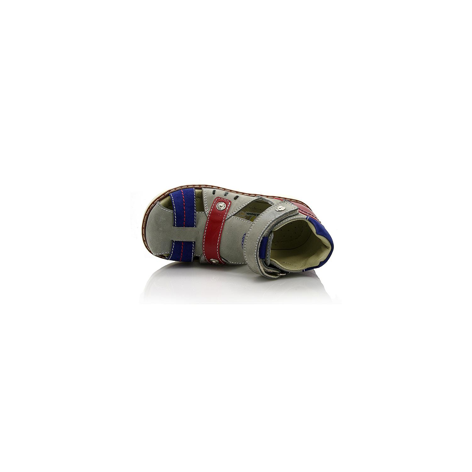 Босоножки ортопедические серого цвета с красными и синими вставками (закрытый носок). Сверху фиксируются липучкой. Снаружи нубук + кожа, внутри кожаные. Высокая твердая пятка, супинатор и ортопедический каблук Томаса.