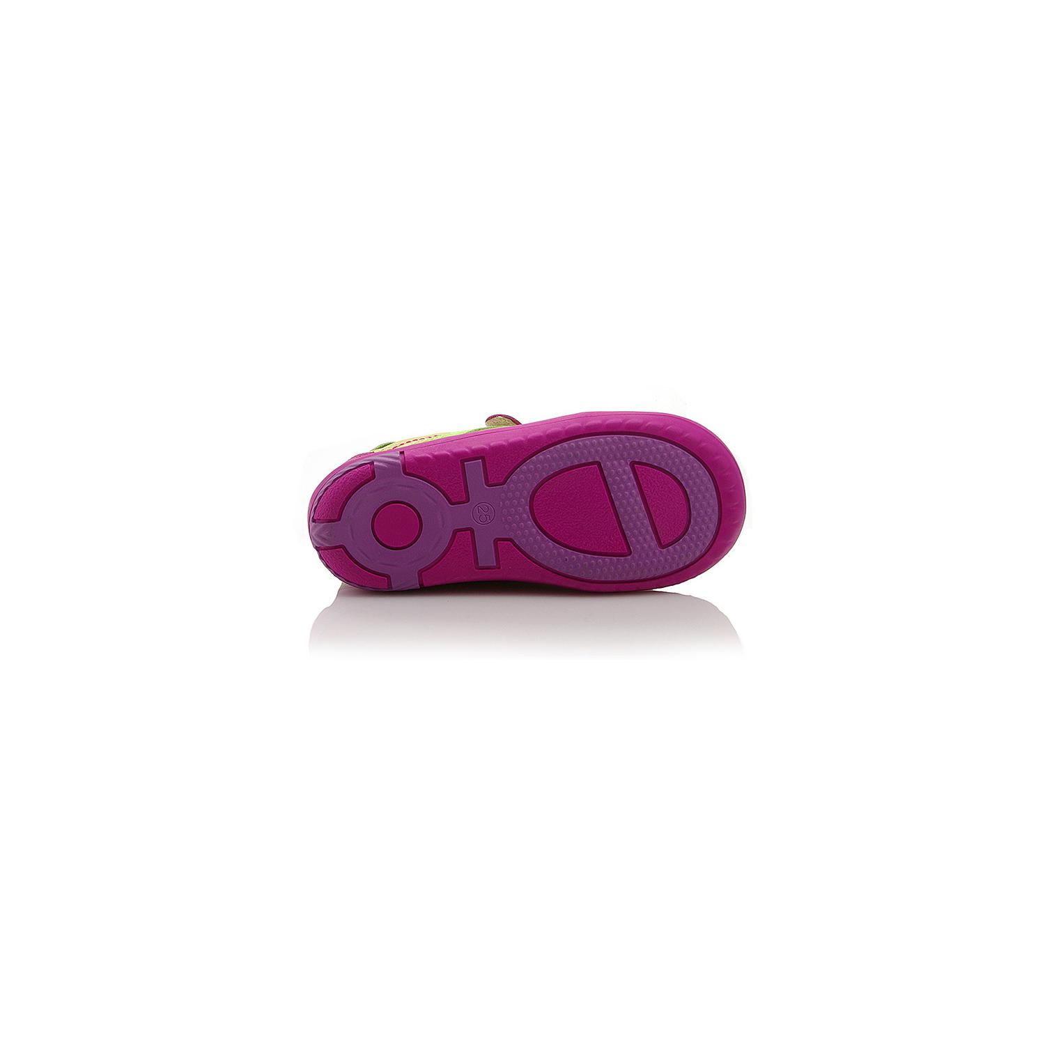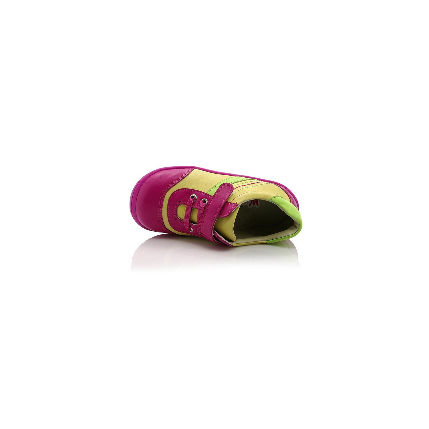 Кроссовки ярко-розового цвета с желтыми вставками. Сверху фиксируются липучкой и двумя резиночками. Снаружи кожа + нубук, внутри кожаные. Есть твердая пятка и супинатор.