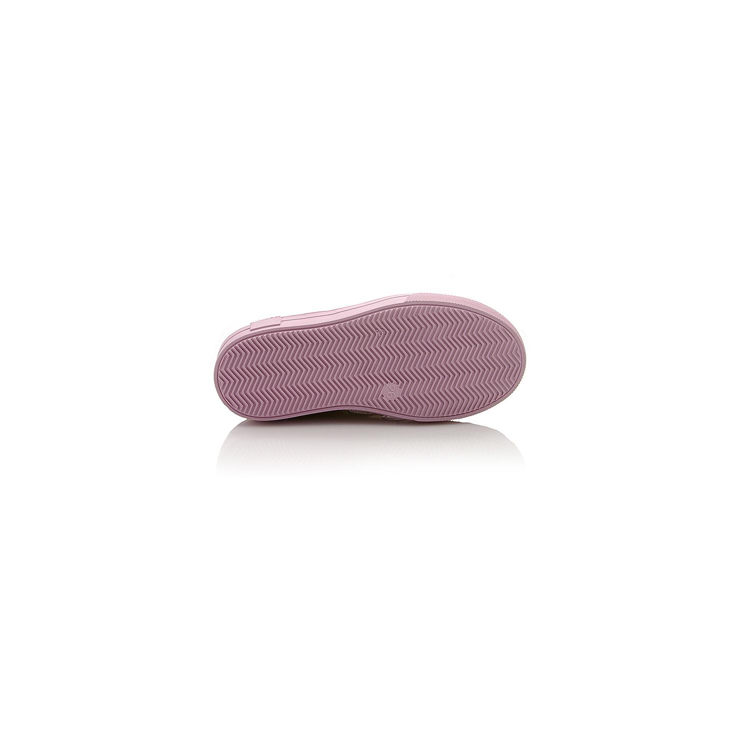 Кроссовки нежно-розового цвета с золотистыми вставками. Сверху фиксируются двумя липучками. Снаружи и внутри кожаные. Есть твердая пятка и супинатор.
