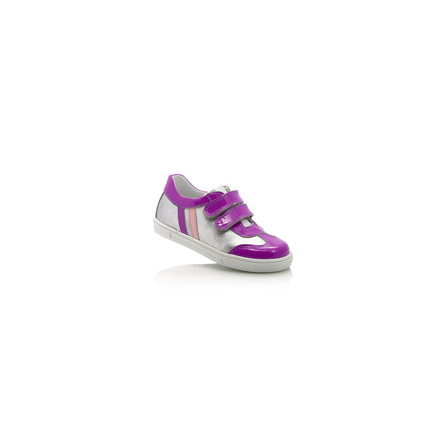 Кроссовки сиреневого цвета с серебристыми вставками. Сверху фиксируются двумя липучками. Снаружи и внутри кожаные. Есть твердая пятка и супинатор.