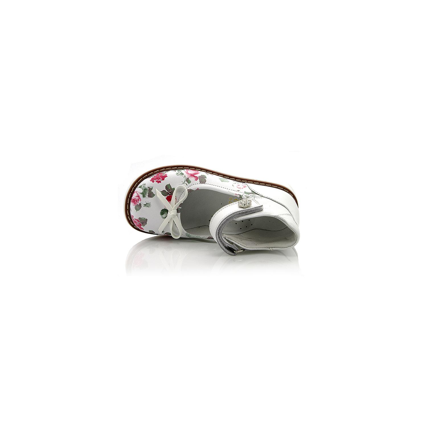 Туфли ортопедические белого цвета с розочками. Сверху регулируются липучкой. Снаружи и внутри кожаные. Высокая твердая пятка, супинатор и ортопедический каблук Томаса.