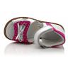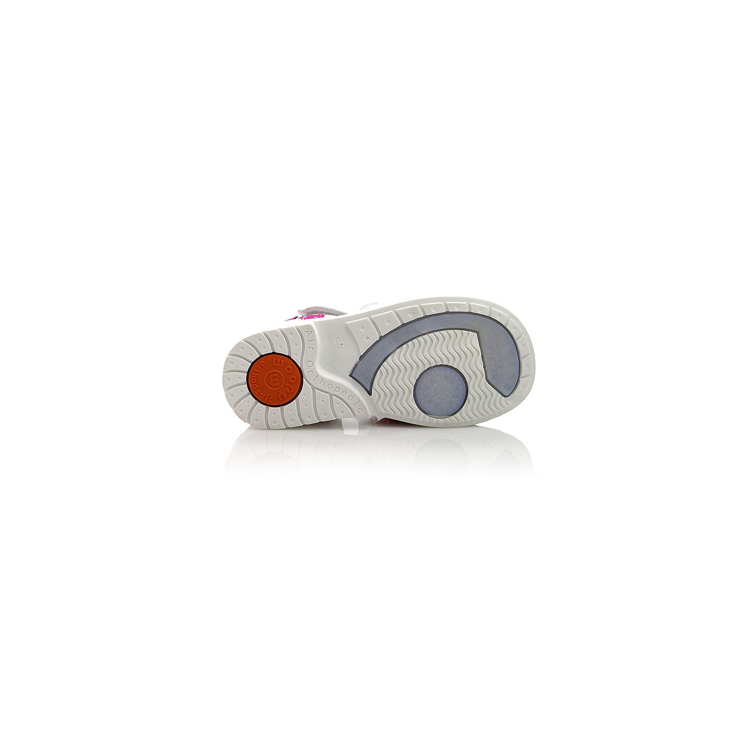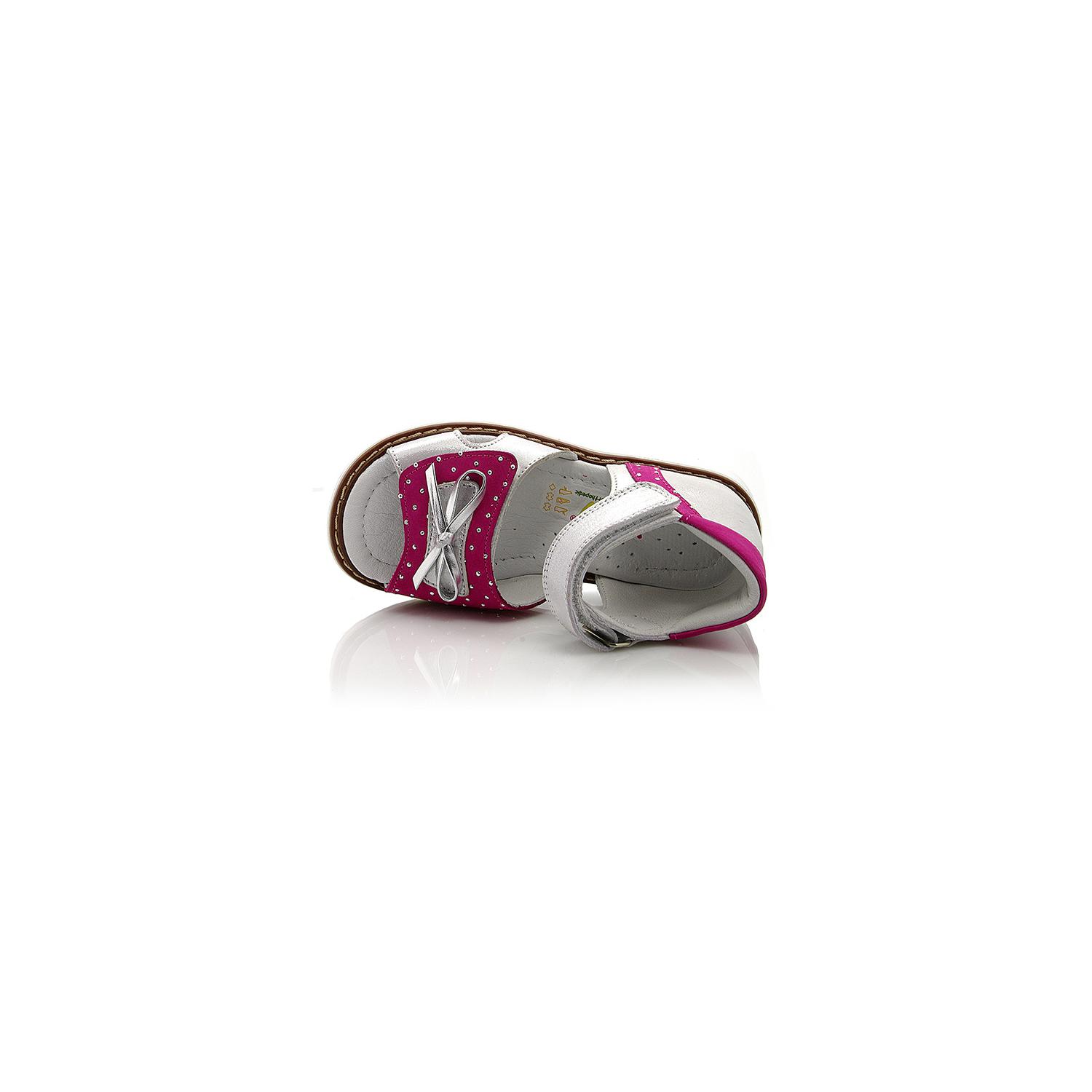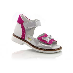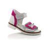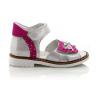 Босоножки ортопедические серебристого цвета с розовыми вставками. Сверху фиксируются двумя липучками. Снаружи кожа + нубук, внутри кожаные. Высокая твердая пятка, супинатор и ортопедический каблук Томаса.