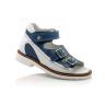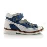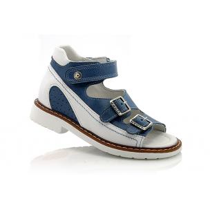 Босоножки ортопедические сине-белого цвета. Снизу регулируются двумя застежками, сверху липучкой. Снаружи и внутри кожаные. Высокая твердая пятка, супинатор и ортопедический каблук Томаса.